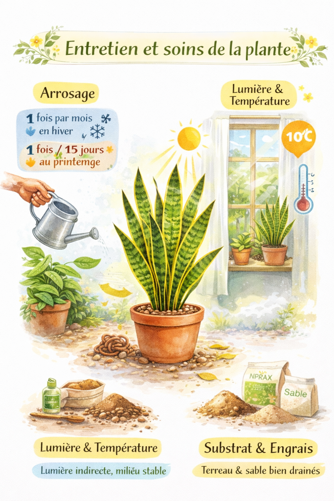 | Sansevieria trifasciata | Modérée | Feuillage large vert foncé, fleurs blanches parfumées |