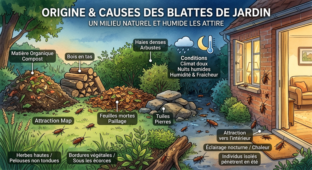 Les blattes de jardin apprécient avant tout les endroits humides, frais, riches en matière organique. Un sol vivant avec beaucoup de feuilles mortes, un compost, des haies denses, ou du bois en tas attire immédiatement cet insecte friand de décomposition.